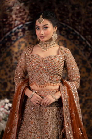 Step into sheer opulence with this Royal Bronze Gold Bridal Lehenga, designed for brides who seek a timeless and regal charm. Lehenga: A breathtaking bronze-gold skirt adorned with intricate sequin, zari, and beadwork, creating a mesmerizing luminous effect. Blouse: A structured sweetheart neckline blouse with full sleeves, heavily embellished with intricate embroidery, adding an elegant flair. Dupatta: A rich rust-orange net dupatta featuring exquisite mirror work and a statement border for a touch of grandeur. This ensemble embodies heritage luxury with a modern silhouette, making it perfect for brides and festive occasions.Sku: Royal Bronze Gold Bridal Lehenga